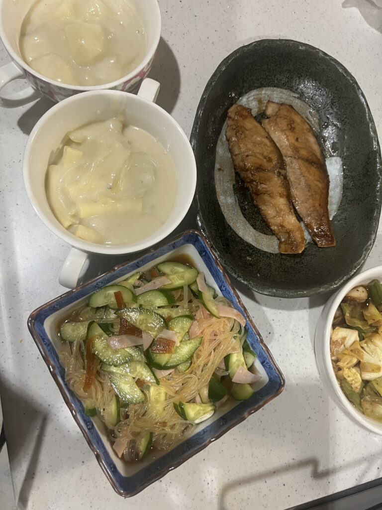 今日は牡蠣のクリームシチューと春雨サラダ、ぶりの照り焼き
