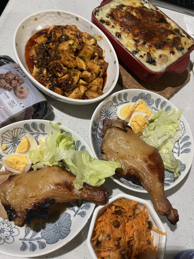 とりあえず牡蠣のグラタン、にんじんのラペ、近所の激安のお肉屋さんで購入したローストチキン(味が染みていて美味しかった)