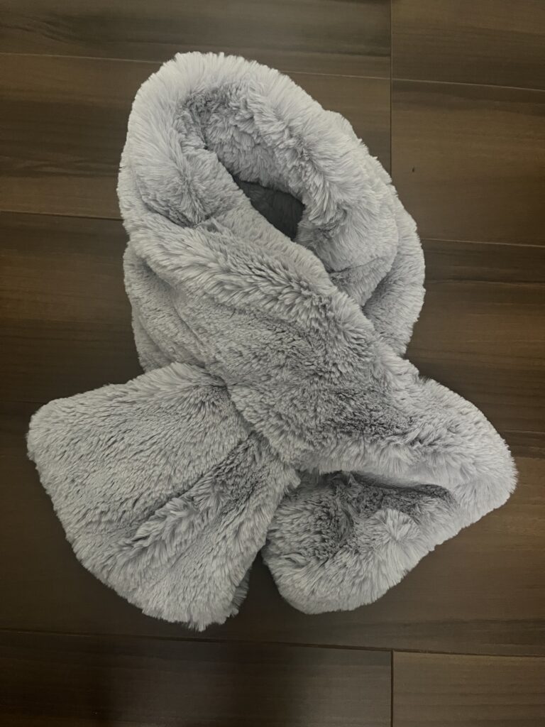 今日は、端を差し込めるようになっているマフラーを、フェイクファーの生地で作ってみました。