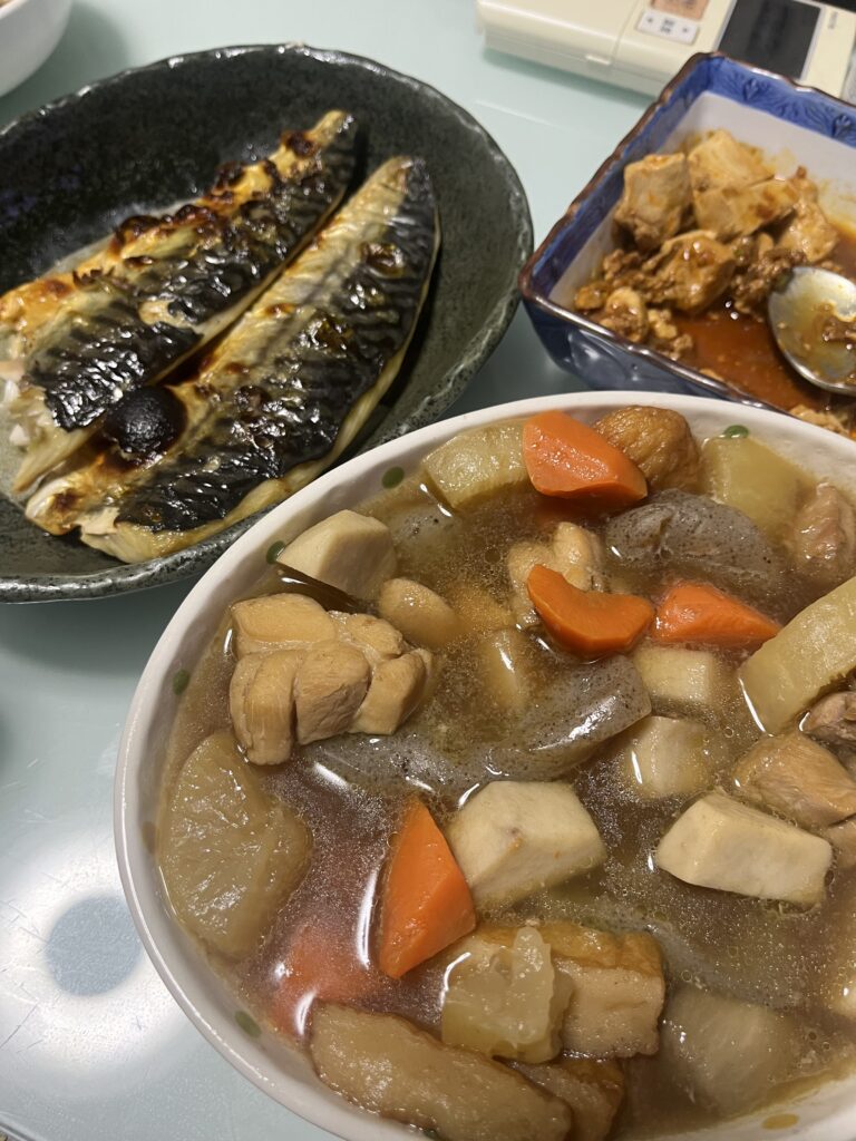 今日の夕飯は昨日の残り物と煮物、鯖の干物です